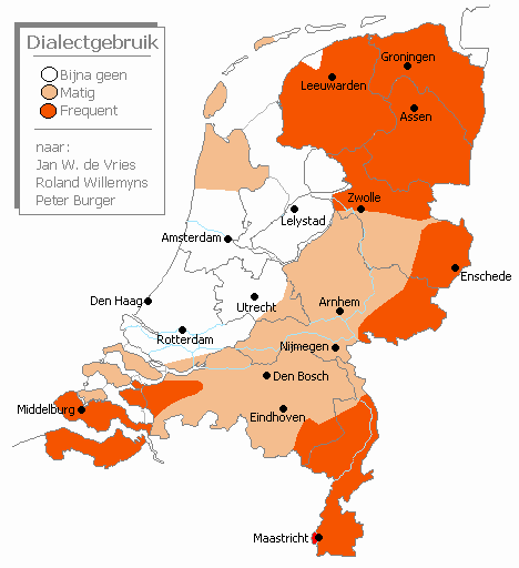 Bijna elke regio in Nederland heeft een eigen dialect en Nederland heeft dus ook enorm veel verschillende dialecten en Friesland heeft zelfs een eigen taal. Dialecten zijn ontstaan doordat van oudsher in Nederlandse streken een variant op het Germaans werd gesproken. De varianten van dorpen in de buurt leken erg op elkaar en hoe verder weg, hoe meer verschillen er in de taal kwamen. Op een gegeven moment kwam er een behoefte dat naburige volkeren beter konden communiceren. Daarom werd er rond 1600 een begin gemaakt aan het ontwerpen van een algemene spreektaal in Nederland, welke een soort van compromis was tussen de vele dialecten. Eigenlijk zijn er dus geen dialecten ontstaan, maar is juist uit deze dialecten het standaard Nederlands ontstaan. Vandaag de dag ligt het heel erg aan de regio hoe vaak met dialect gesproken wordt, in de Randstad bijna tot geen en in Limburg en Groningen heel frequent. Tegenwoordig wordt er steeds minder dialect gesproken in Nederland, vooral in de Randstad. Dit komt doordat mensen steeds meer met elkaar in verbinding komen en ook meer door elkaar heen wonen. Dit zal ervoor zorgen dat er steeds minder dialecten komen in Nederland.